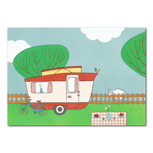 Kamperen bij de boer is een feestje met deze retro caravan. Deze ansichtkaart (10,5 x 14,8 cm) is met de hand getekend en digitaal afgemaakt. De kaart is professioneel gedrukt op 350 grams papier e...